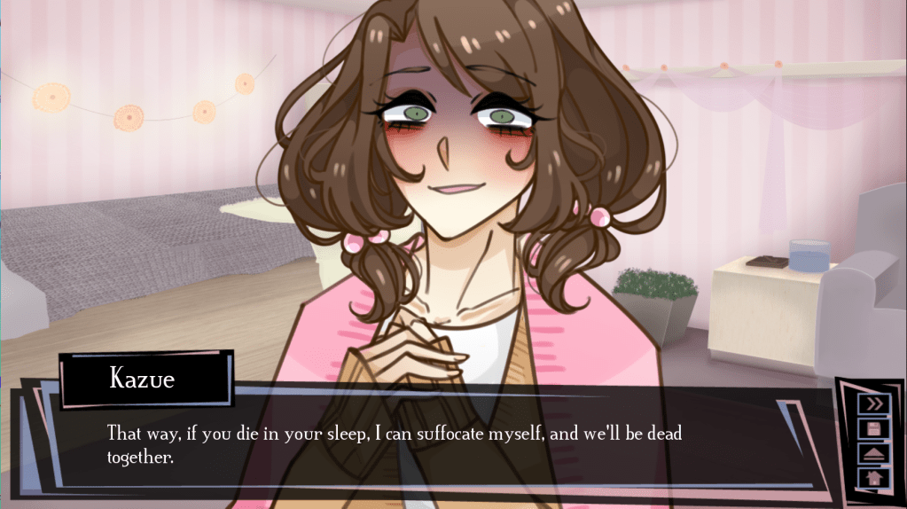 Eventually, Kazue pressurized the protagonist into moving into her home and staying with her for good. She then proceed to murder Nanako who had taken care of her thus far, as she thinks that there is no need for Nanako anymore now that the protagonist is together with her.