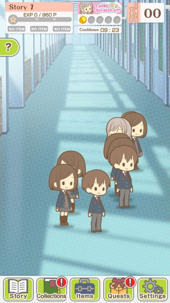 In Search of Haru is a tap game whereby players tap on the students on screen to talk to them and earn star fragments to make progress in the story. There are 3 love interests, and a total of 4 endings in the game (1 for each love interest and 1 bad ending). The narrative is mostly linear, as the story only branches out twice nearing the end. As the game is very short, it can be completed in a few hours. The progress can be accelerated by watching advertisements.