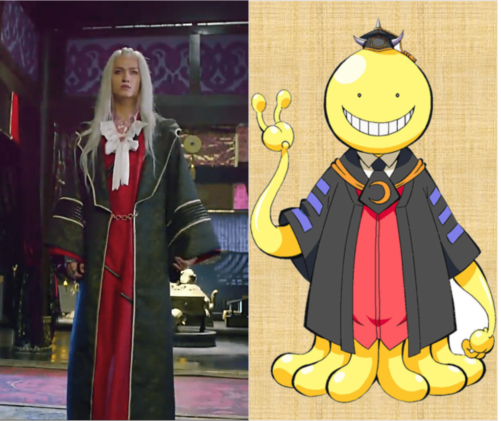 There is one thing I cannot stand about him though: his terrible wardrobe. I understand that he is a vampire, but does that means he have to wear 10 sets of eyelashes on his upper eyelid, and 3 shorter ones on the bottom?? Does that means he has to have long white hair dry that is dry like straws? Does it means he have to spot an funky outfit like a 2D anime character, or more specifically, Koro-sensei? For the record, feel free to compare the two outfits below: