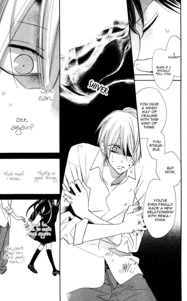 Eventually, Seika managed to coax him out his shell, and the two learn to accept each other and grow together. However, tragedy soon struck Seika, as she suffered a sudden lost of sight due to a ruptured cerebral aneurysm. This is the part where Akiharu became more unstable.