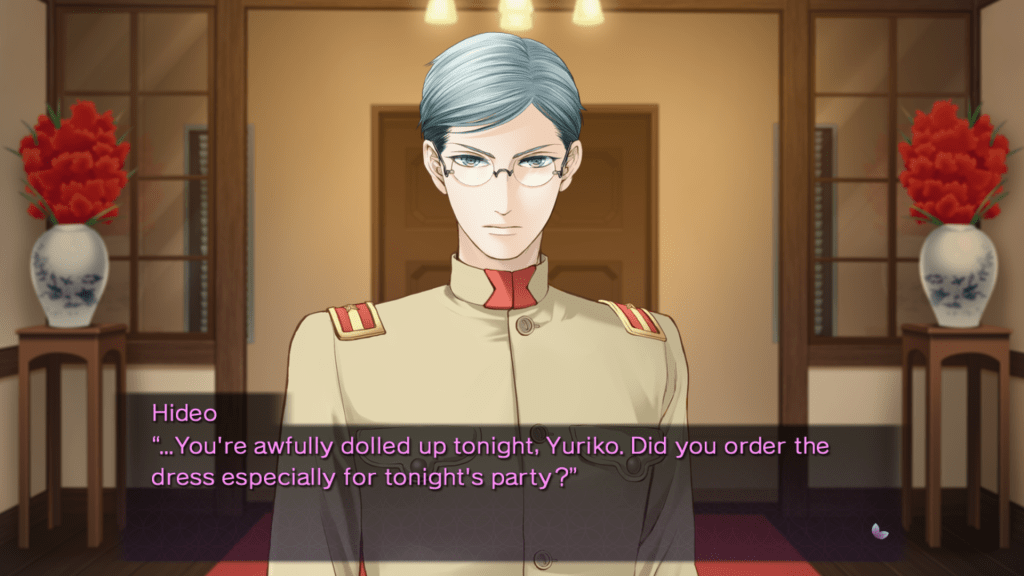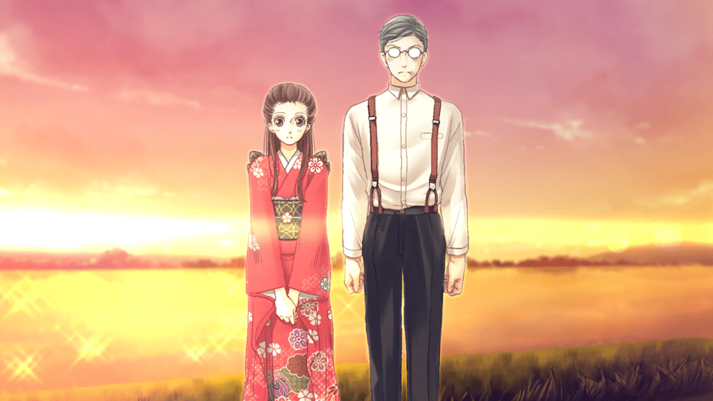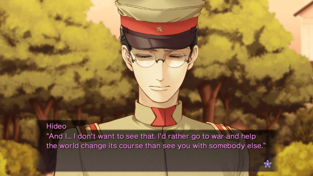 Regardless, Hideo ended up going to war. In the good end, Hideo came back in time and saved Yuriko from an assault. After learning that the two of them were truly in love with each other, his fiancé decided to withdraw from their engagement. Hideo and Yuriko married each other, and even had a child. Hideo quit his lieutenant position, and decided to pursue his long term passion as an avian researcher.