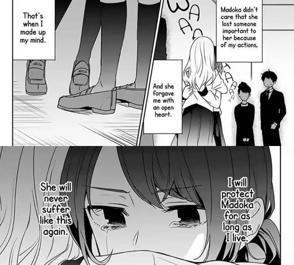 Once, when the two met for a cooking session together at Madoka’s house, Amane’s carelessness resulted in a fire that ultimately killed Madoka’s single mother. The guilt and Madoka’s apparent forgiveness made Amane swear to protect Madoka for life.