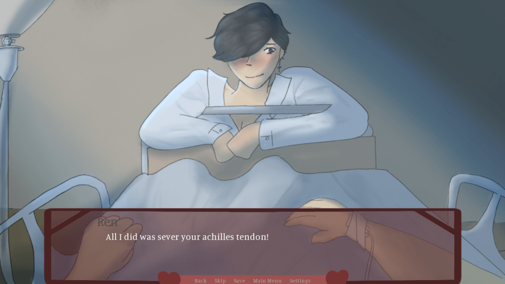 In his ending, the protagonist failed to escape and got captured by Ren. Ren has had medical training due to his parents owning hospitals, and they have hoped to involved him in the entire business. (How that translated to actual surgical skills and medical expertise which would have took decades to master, I have no idea. Game logic.) To prevent her escape again, Ren surgically severed her Achilles tendon so that the protagonist may never walk again and would be fully dependent on him.