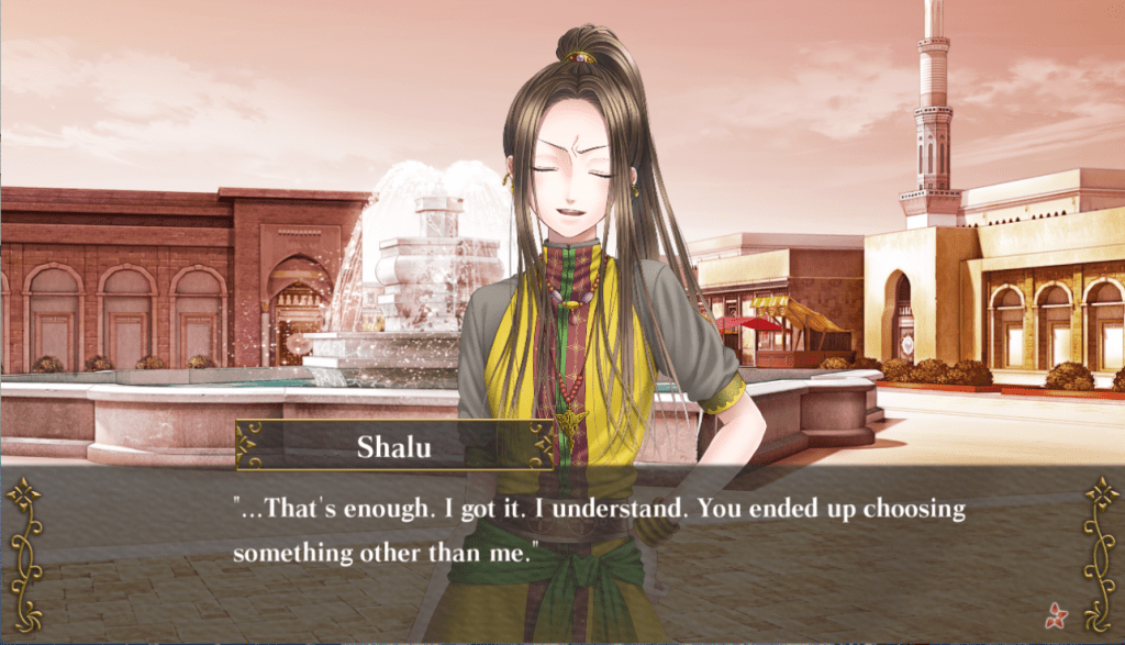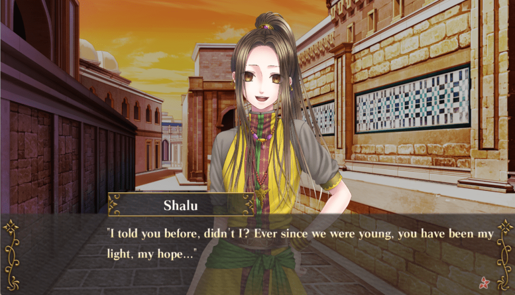 Shalu’s yandere tendencies did not show much in other routes, but it was extremely clear in Suren’s. In his route, Shalu’s escape attempt was spoiled by Suren, who had been waiting for such an incident to happen so that he can use it to bait Naala into becoming his bride. To protect Shalu, Naala agreed to his terms, and this made Shalu even more determined to get Naala out of Nasla, whatever the cost she must pay.